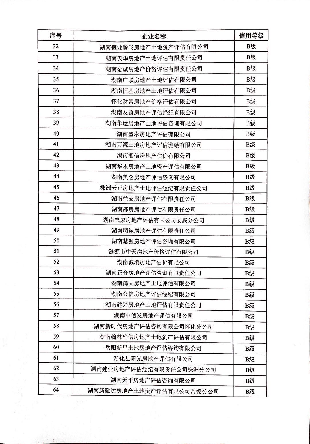 根據(jù)《湖南省房地產(chǎn)業(yè)協(xié)會房地產(chǎn)行業(yè)信用評價管理辦法(試行)》(湘房協(xié)〔2018〕15號)相關(guān)規(guī)定,我會按程序?qū)θ?58家評估機構(gòu)進(jìn)行信用評價,其中信用等級為A級的企業(yè)14家,信用等級為B級的企業(yè)53家,信用等級為C級的企業(yè)76家,信用等級為D級的企業(yè)6家,無等級9家,現(xiàn)予公布。