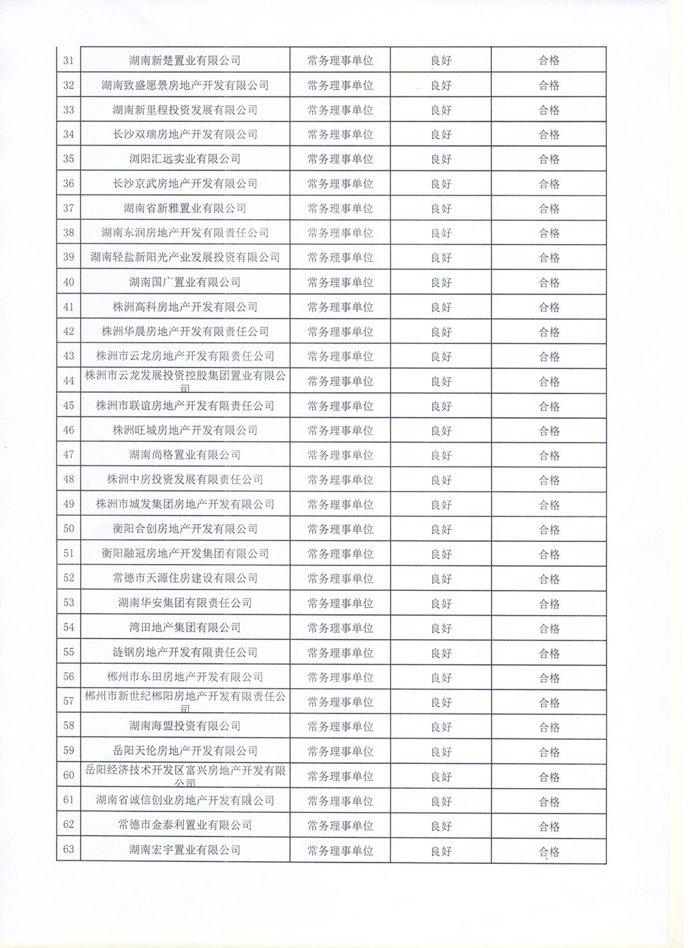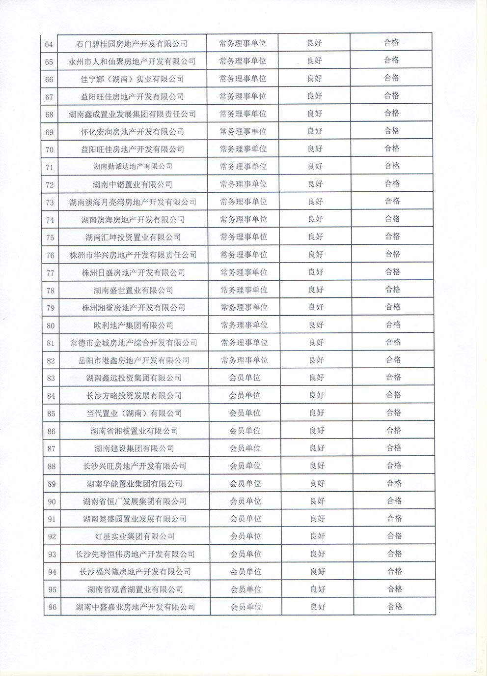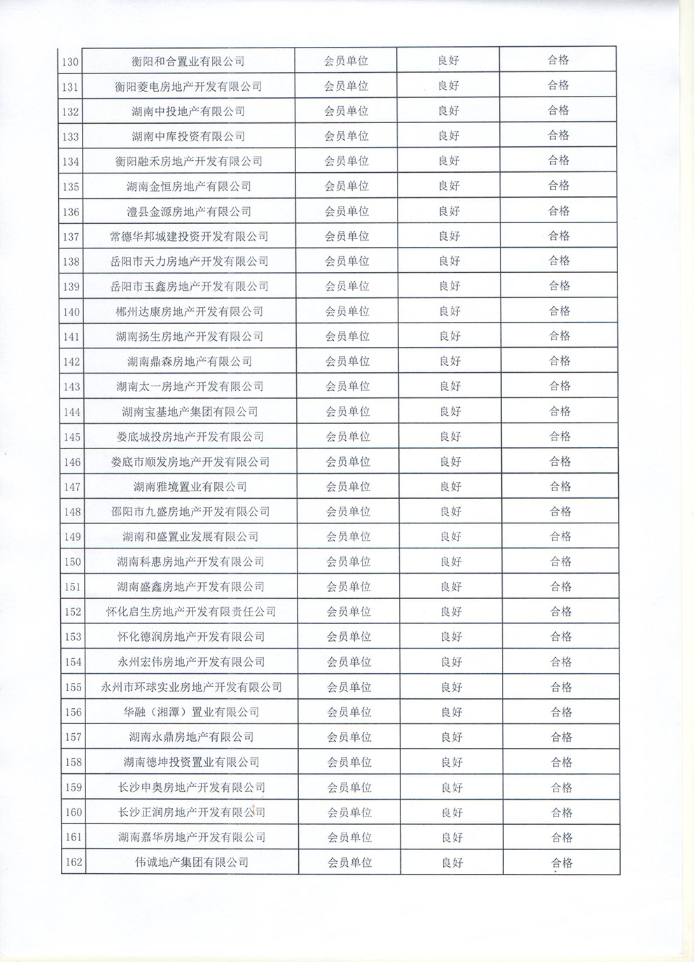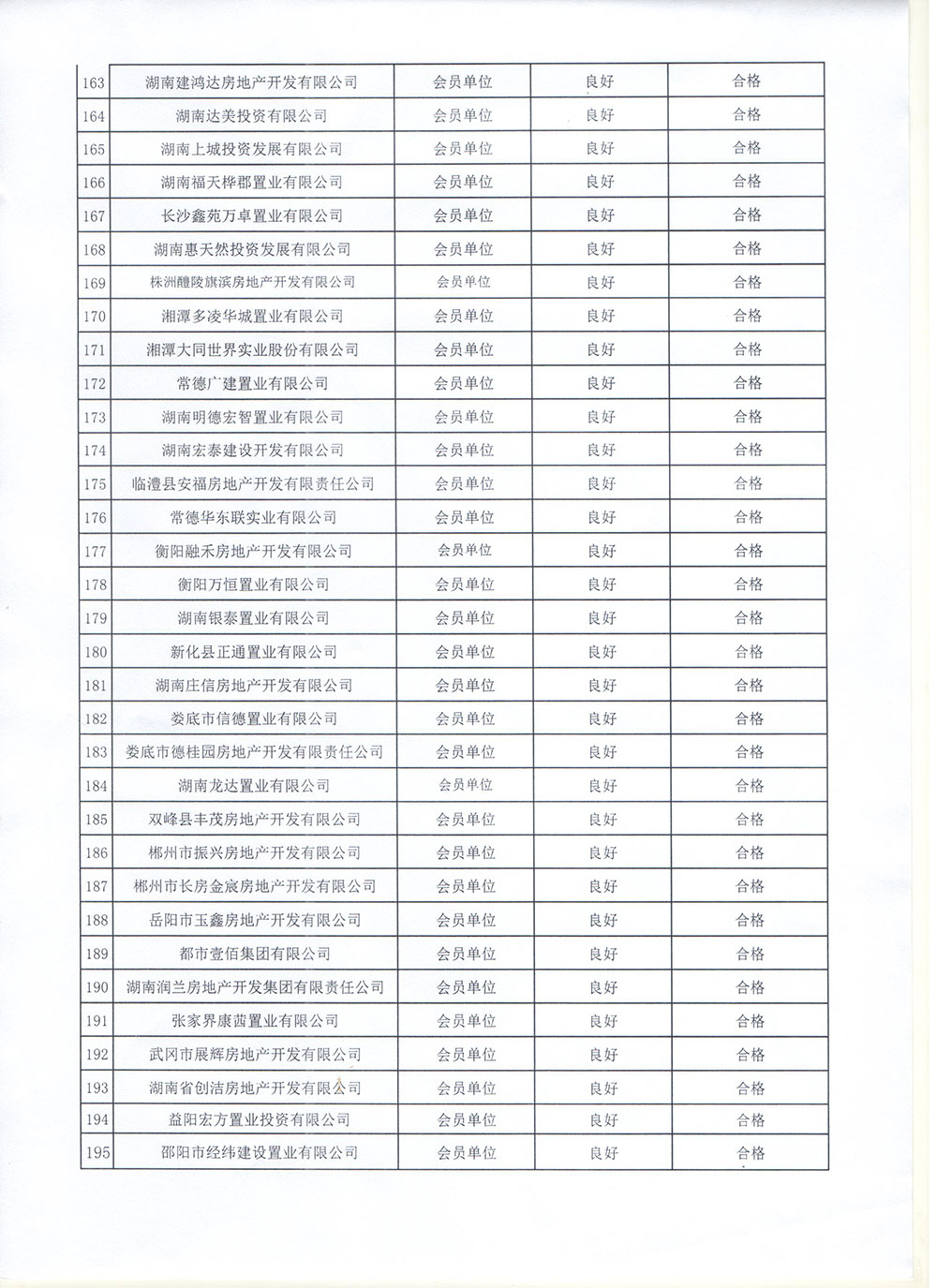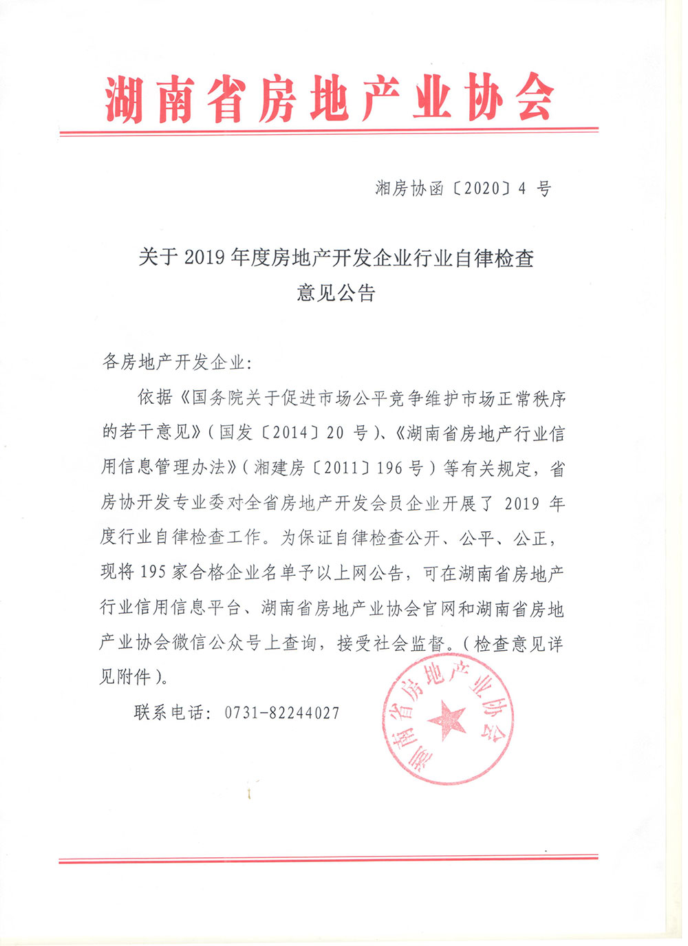依據《國務院關于促進市場公平競爭維護市場正常秩序的若干意見》(國發〔2014〕20號)、《湖南省房地產行業信用信息管理辦法》(湘建房〔2011〕196號)等有關規定,省房協開發委對全省房地產開發會員企業開展了2019年度行業自律檢查工作。為保證自律檢查公開、公平、公正,現將195家合格企業名單予以上網公吿,可在湖南省房地產行業信用信息平臺、湖南省房地產業協會官網和湖南省房地產業協會微信公眾號上查詢,接受社會監督。(檢查意見詳見附件)。