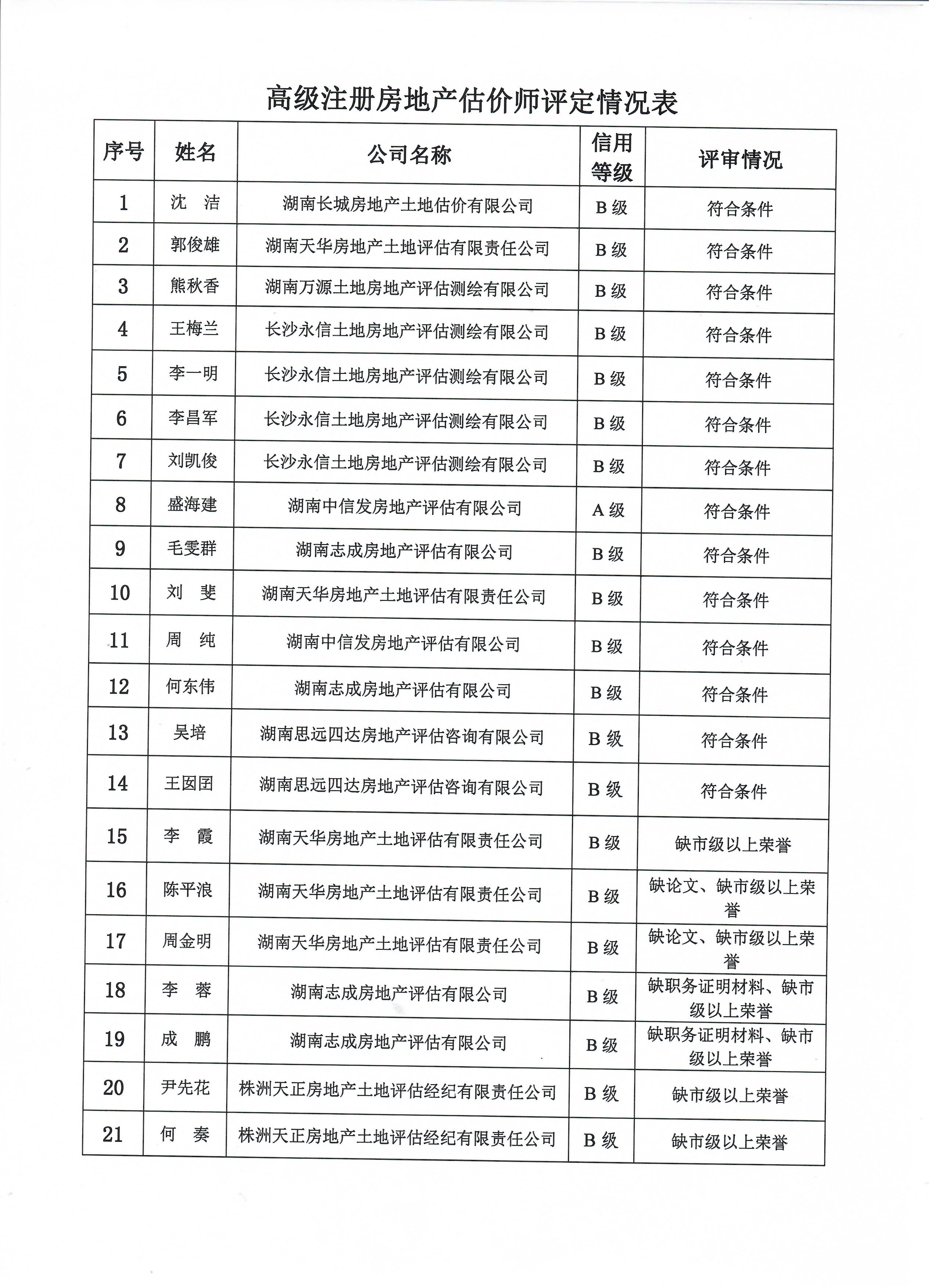 關于湖南省注冊房地產估價師執業等級評定情況的公示