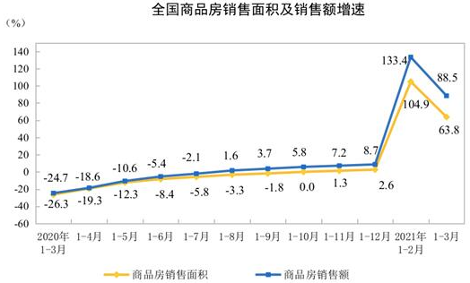 ??1—3月份,商品房銷售面積36007萬平方米,同比增長63.8%;比2019年1—3月份增長20.7%,兩年平均增長9.9%。其中,住宅銷售面積增長68.1%,辦公樓銷售面積增長34.4%,商業營業用房銷售面積增長24.9%。商品房銷售額38378億元,增長88.5%;比2019年1—3月份增長41.9%,兩年平均增長19.1%。其中,住宅銷售額增長95.5%,辦公樓銷售額增長44.0%,商業營業用房銷售額增長25.8%。