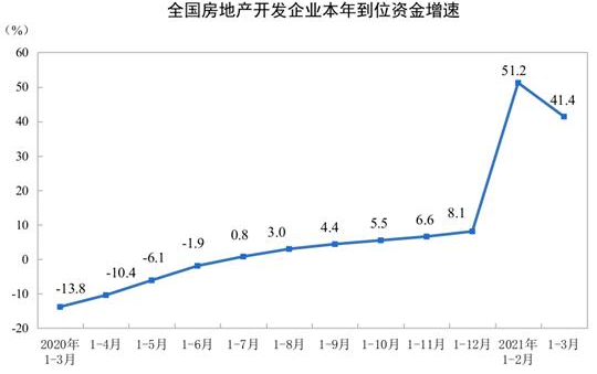 ??1—3月份,房地產開發企業到位資金47465億元,同比增長41.4%;比2019年1—3月份增長21.9%,兩年平均增長10.4%。其中,國內貸款7222億元,增長7.5%;利用外資11億元,下降41.0%;自籌資金13015億元,增長21.0%;定金及預收款17759億元,增長86.1%;個人按揭貸款7843億元,增長50.0%。