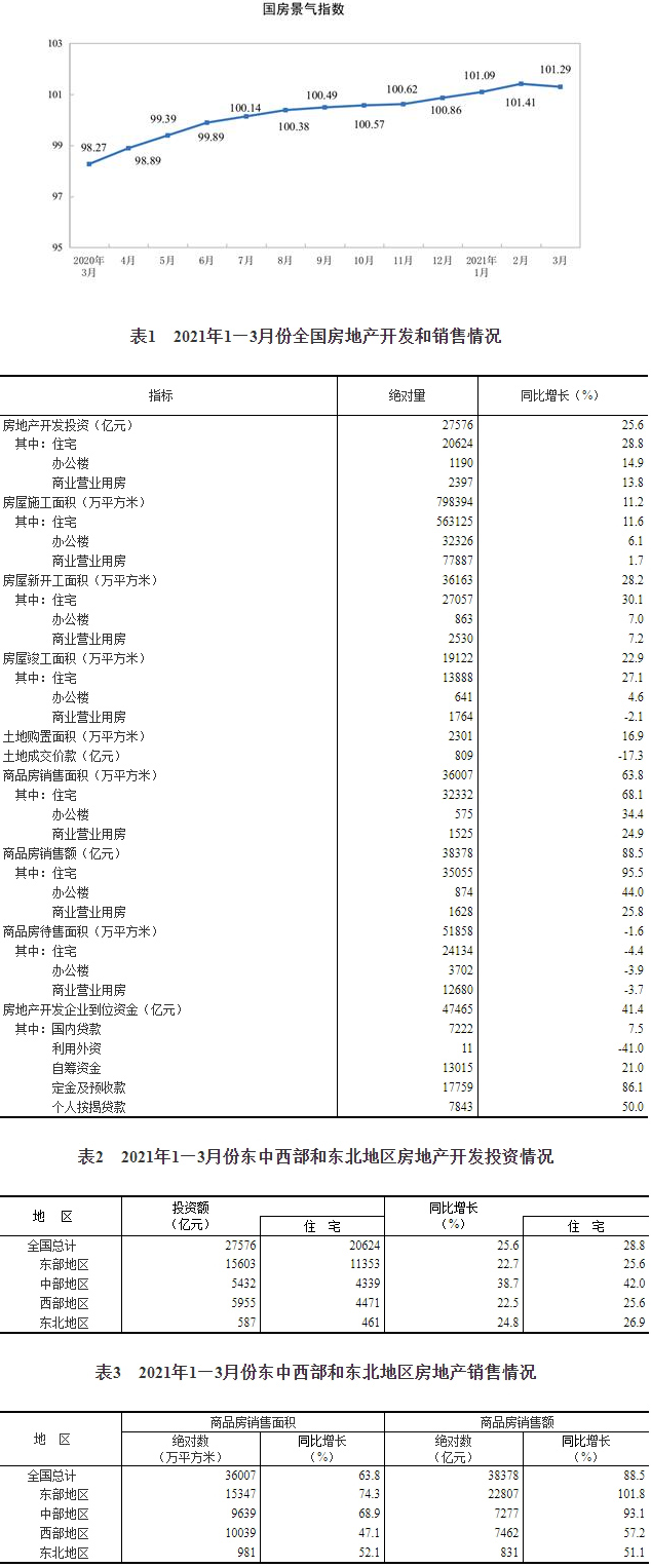 國家統計局 | 2021年1—3月份全國房地產開發投資和銷售情況