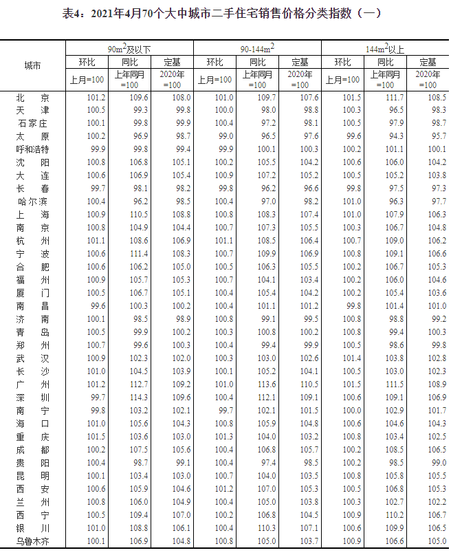 2021年4月份70個大中城市商品住宅銷售價格變動情況