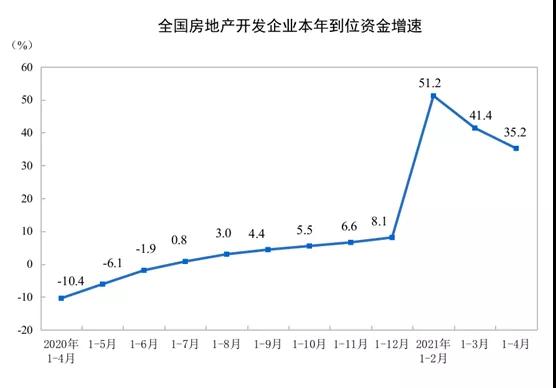 1—4月份,房地產開發企業到位資金63542億元,同比增長35.2%;比2019年1—4月份增長21.1%,兩年平均增長10.1%。其中,國內貸款9043億元,增長3.6%;利用外資17億元,下降28.3%;自籌資金17167億元,增長15.4%;定金及預收款24362億元,增長74.1%;個人按揭貸款10738億元,增長41.3%。