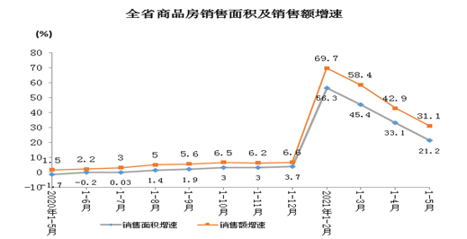1-5月,全省商品房銷售面積3083.86萬平方米,同比增長21.2%;比2019年1-4月增長19.2%,兩年平均增長9.2%。其中,住宅銷售面積增長22.4%,辦公樓銷售面積增長39.9%,商業營業用房銷售面積增長20.4%。商品房銷售額2027.84億元,增長31.1%。其中,住宅銷售額增長33.5%,辦公樓銷售額增長70.8%,商業營業用房銷售額增長12.2%。