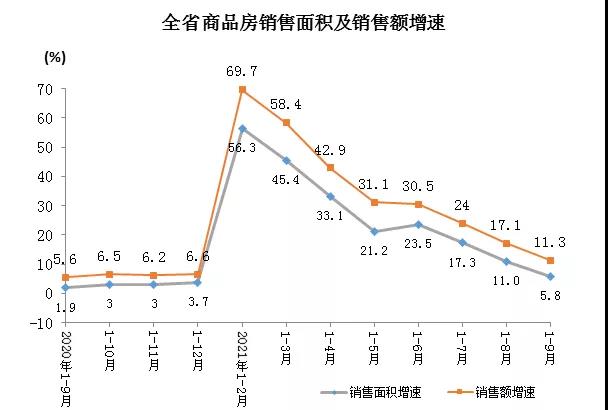 前三季度,全省商品房銷售面積6303.79萬平方米,同比增長(zhǎng)5.8%,兩年平均增長(zhǎng)3.8%。其中,住宅銷售面積增長(zhǎng)6.8%,辦公樓銷售面積下降5.0%,商業(yè)營(yíng)業(yè)用房銷售面積增長(zhǎng)2.5%。商品房銷售額4171.07億元,增長(zhǎng)11.3%。其中,住宅銷售額增長(zhǎng)13.2%,辦公樓銷售額增長(zhǎng)5.6%,商業(yè)營(yíng)業(yè)用房銷售額下降0.8%。