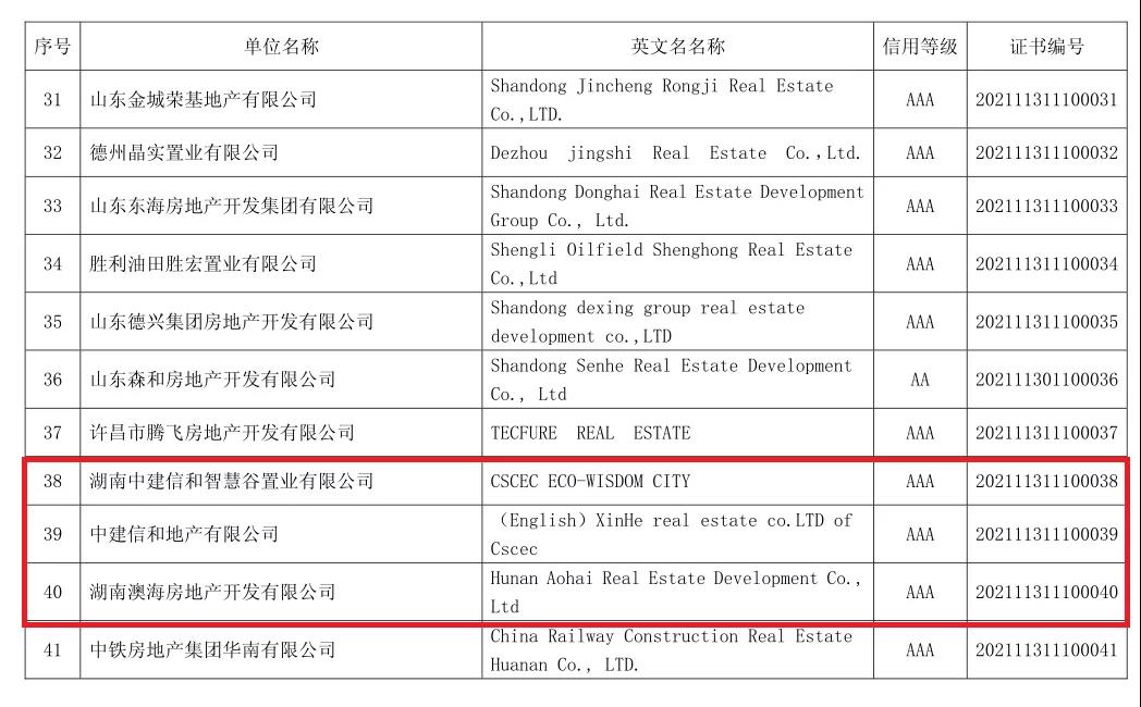 12月29日,中國房地產業協會公布2021年信用等級AAA房地產開發企業名單,我會會員單位中建信和地產有限公司、湖南澳海房地產開發有限公司、湖南中建信和智慧谷置業有限公司獲得“2021年信用等級AAA級房地產開發企業”評價。