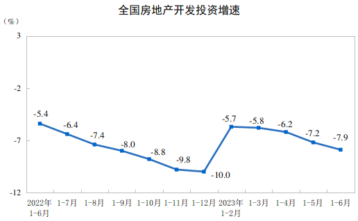 具體來看,房地產開發投資增速降幅繼續擴大。上半年全國房地產開發投資58550億元,同比下降7.9%;其中,住宅投資44439億元,下降7.3%。