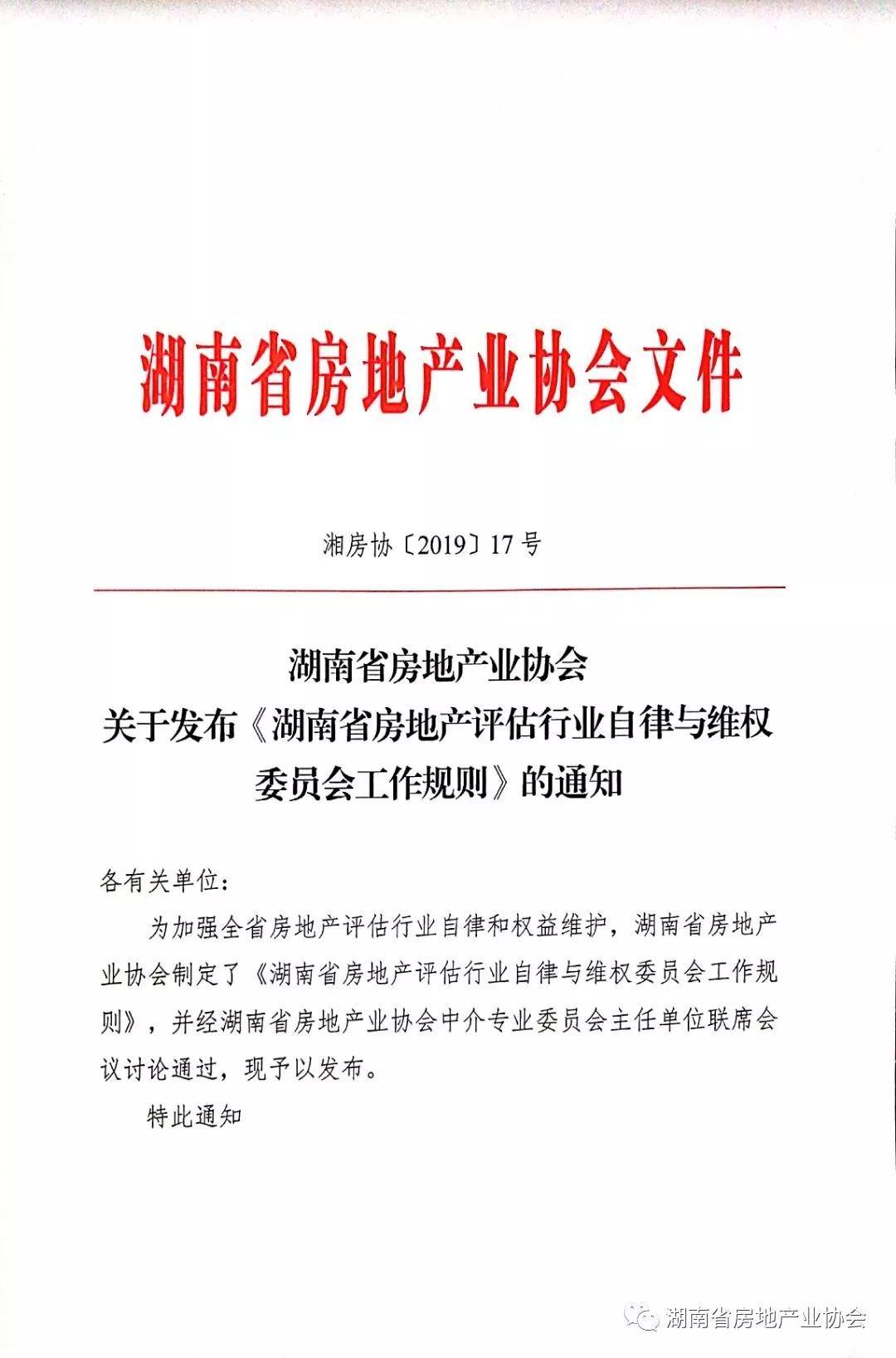 關于發布《湖南省房地產評估行業自律與維權委員會工作規則》的通知