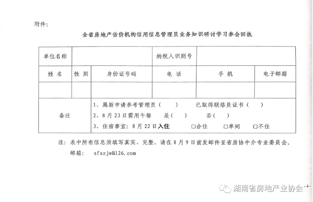 3、各機構(gòu)收到通知后,及時確定專職管理員。同時將參會回執(zhí)于8月9日前發(fā)郵件至湖南省房地產(chǎn)業(yè)協(xié)會中介專業(yè)委員會郵箱(sfxzjw@126.com)。