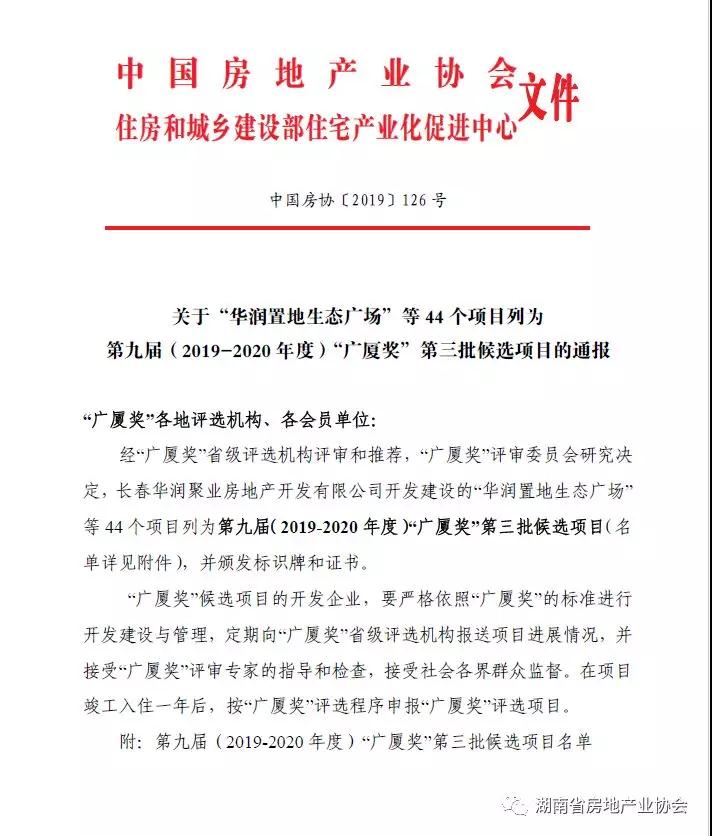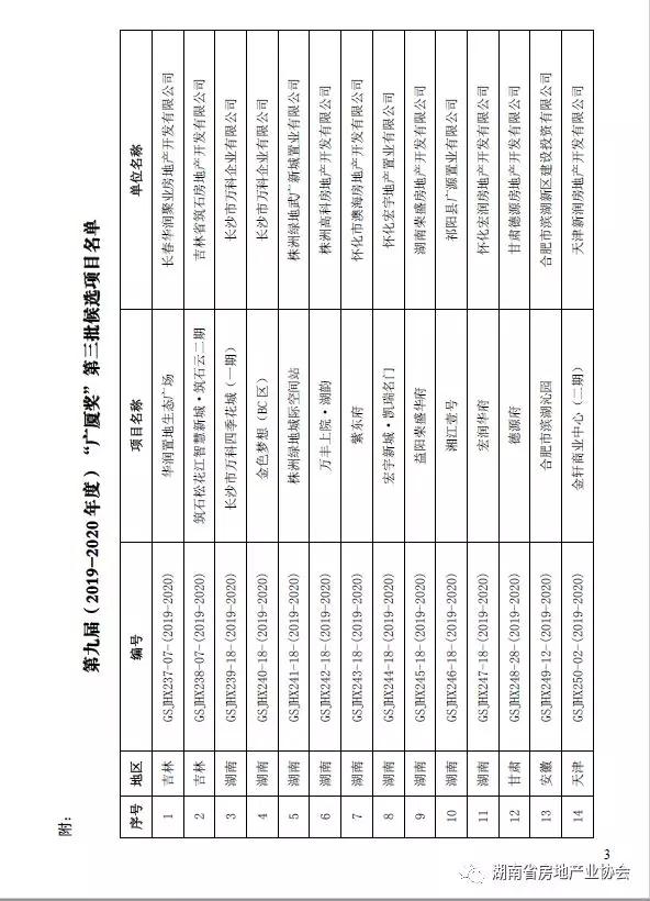 依據(jù)“廣廈獎”管理辦法和評價標準,經(jīng)企業(yè)申報,“廣廈獎”省級評選機構初審及推薦,“廣廈獎”評審專家組終審,“廣廈獎”評審委員會審定,并經(jīng)公示等程序,湖南省有九個項目,列入第九屆“廣廈獎”第三批候選項目名單,獲得候選項目名單有長沙市萬科四季花城(一期)、金色夢想、株洲綠地城際空間站、萬豐上院·湖韻、紫東府、宏宇新城·凱瑞名門、益陽榮盛華府、湘江壹號、宏潤華府九個項目,希望湖南有更多的優(yōu)秀項目參與廣廈獎申報,提升住房品質。