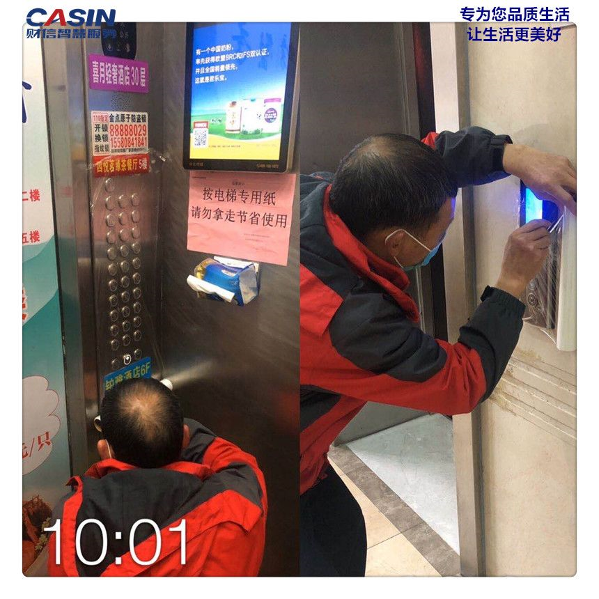 ___為確保業主出行健康安全,工程師傅張志雄被安排提前上崗,更換電梯按鍵薄膜以及紙巾;