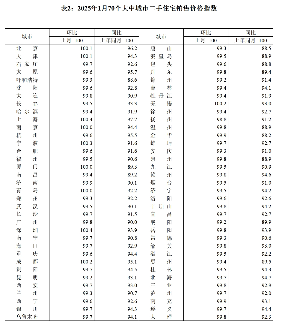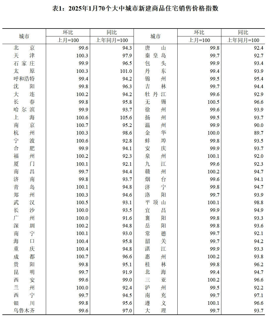 國家統(tǒng)計(jì)局今日發(fā)布的《70個(gè)大中城市商品住宅銷售價(jià)格變動情況》顯示,2025年1月份70個(gè)大中城市中新建商品住宅和二手住宅銷售價(jià)格環(huán)比上漲城市分別有24個(gè)和7個(gè),比上月分別增加1個(gè)和減少2個(gè);同比上漲城市分別有2個(gè)和0個(gè),與上月均持平。