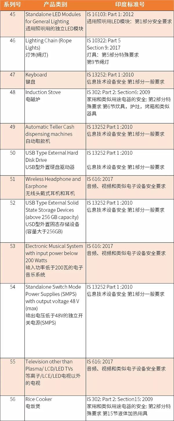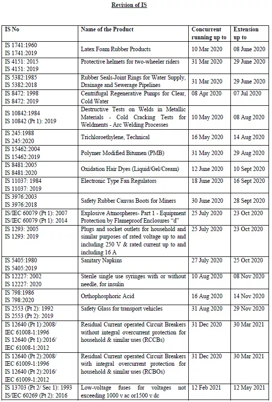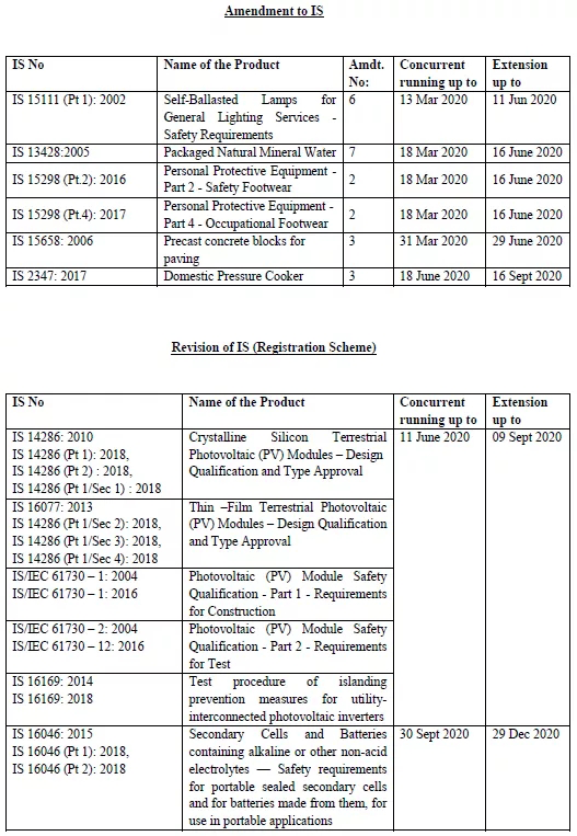 另外,印度中央標(biāo)準(zhǔn)局于2020年3月27日發(fā)布通知,由于受疫情影響, 將推后原本將于2020年3月1日及之后強制執(zhí)行的新版IS標(biāo)準(zhǔn),由原定執(zhí)行日期起推遲90天,詳情如下:
