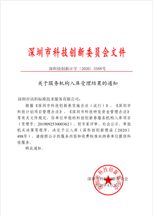 重要通知:我司深圳市訊科標準技術成科技創新券的服務機構