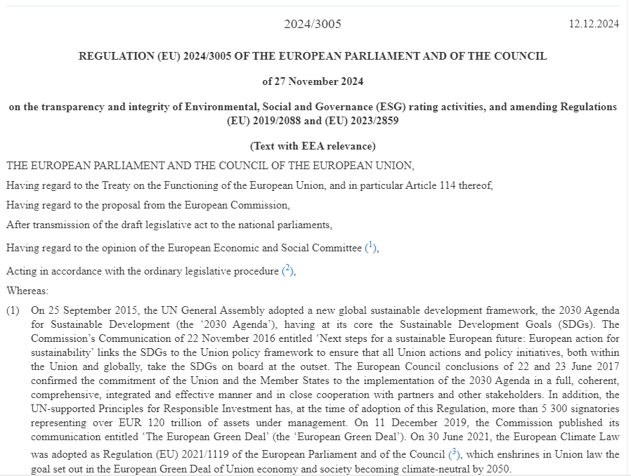 2024年12月12日,歐盟《官方公報》上正式發(fā)布關(guān)于環(huán)境、社會和治理(ESG)評級活動的新法規(guī)[法規(guī)編號(EU) 2024/3005]。這一新規(guī),對原有的歐盟法規(guī)(EU) 2019/2088和(EU) 2023/2859做出修訂。這一法規(guī)旨在使歐盟境內(nèi)的ESG評級活動更加一致、透明并更具可比性。歐盟認(rèn)為,此舉將提升投資者對可持續(xù)金融產(chǎn)品的信心,并促進歐盟內(nèi)部市場的有效運作。