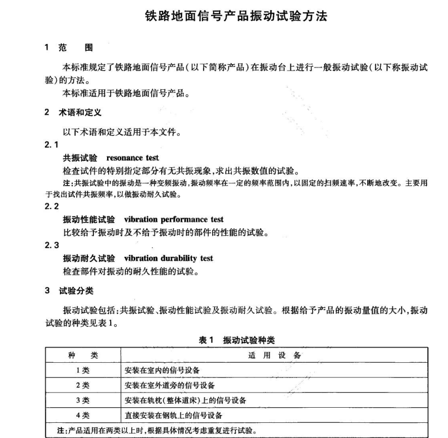 本標準適用于鐵路地面信號產品的振動試驗,這些產品包括但不限于信號機、道岔轉換裝置、軌道電路設備等。目的是驗證這些設備在運輸、安裝及運行過程中可能遇到的各種振動條件下能否正常工作。