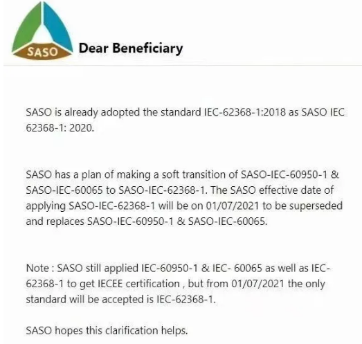 近期,沙特阿拉伯標(biāo)準(zhǔn)化組織(SASO)已宣布采用新的SASO-IEC 62368-1:2020(IEC 62368-1:2018 3.0版)標(biāo)準(zhǔn)。自2021年7月1日起,對(duì)于音頻/視頻、信息和通信技術(shù)設(shè)備,沙特SASO將僅接受SASO-IEC 62368-1:2020用于申請(qǐng)SASO IECEE(SIRC)證書(shū)和SABER合格機(jī)構(gòu)認(rèn)證(CoC),不再接受基于SASO-IEC 60950-1和SASO-IEC 60065標(biāo)準(zhǔn)的申請(qǐng)。
