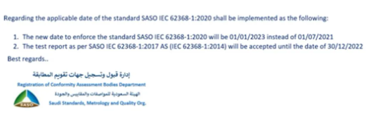 IEC 62368-1: 2018 (即SASO IEC 62368-1:2020) 的強(qiáng)制執(zhí)行日期延后至2023年1月1日 ,也就是自2023年1月1日起將不再接受IEC 62368-1:2014第二版的CB證書(shū)與報(bào)告,只接受IEC 62368-1:2018(第三版)的CB證書(shū)與報(bào)告 。