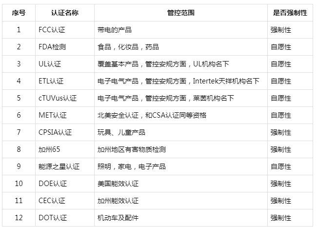 對于常見產(chǎn)品出口美國所需的認證大概有這12類: