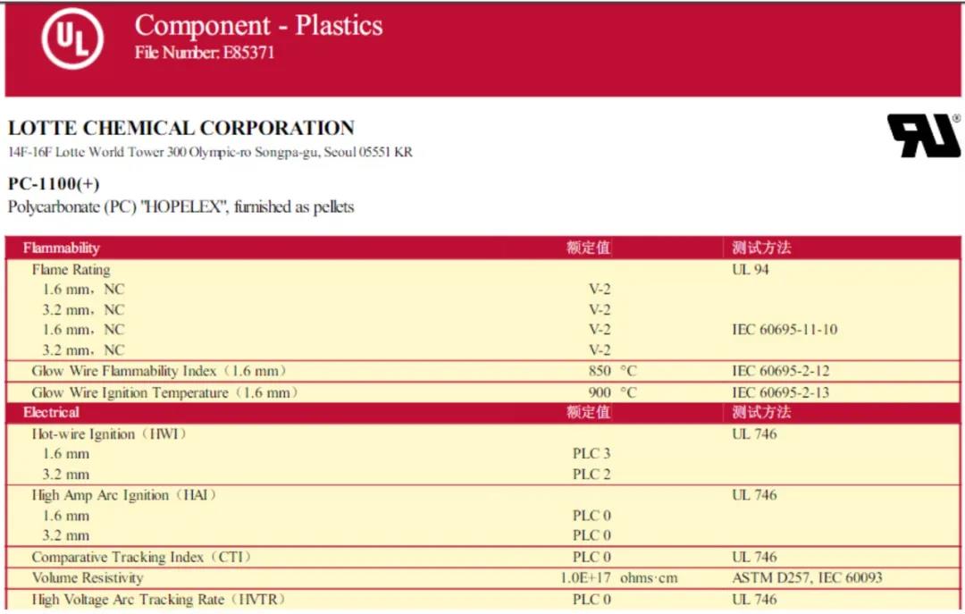 NC為天然色(無著色的顏色)BK為黑色ALL為全部顏色。Min.Thick.試片最小厚度單位為mm。在上述黃卡中,試片厚度為3mm時,難燃性為5VA。試片厚度為1mm時,難燃性為5VB。