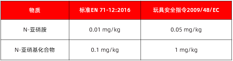 注:標(biāo)準(zhǔn)EN 71-12:2016中第4.2條表2第a點中的限值(即針對意圖供36個月以下兒童使用,且意圖或可能放入口中的彈性體玩具的限值)低于玩具安全指令2009/48/EC附件II第III部分第8點中規(guī)定的符合的限值。這些限值具體如下: