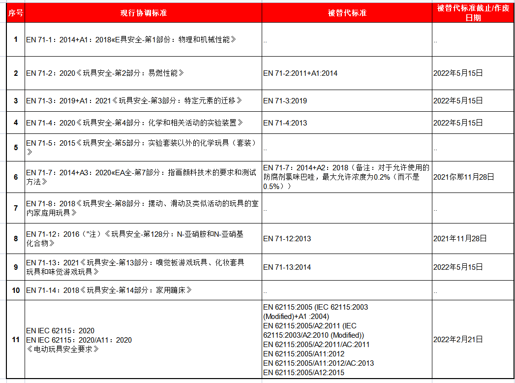 結(jié)合2021年5月31日更新的EN 71-7、EN 71-12和EN IEC 62115三項協(xié)調(diào)標(biāo)準(zhǔn)后,最新的歐盟玩具安全指令(2009/48/EC)協(xié)調(diào)標(biāo)準(zhǔn)總結(jié)如下表: