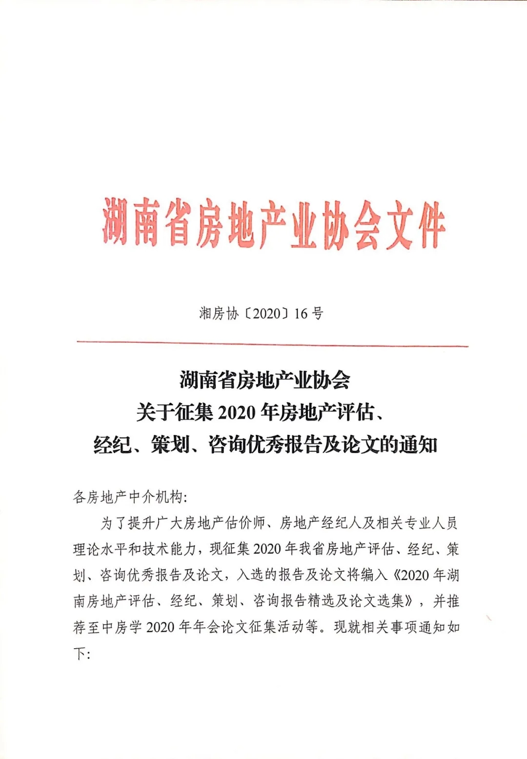 為了提升廣大房地產估價師、房地產經紀人及相關專業人員理論水平和技術能力,現征集2020年我省房地產評估、經紀、策劃、咨詢優秀報告及論文,入選的報告及論文將編入《2020年湖南房地產評估、經紀、策劃、咨詢報告精選及論文選集》,并推薦至中房學2020年年會論文征集活動等。現就相關事項通知如下: