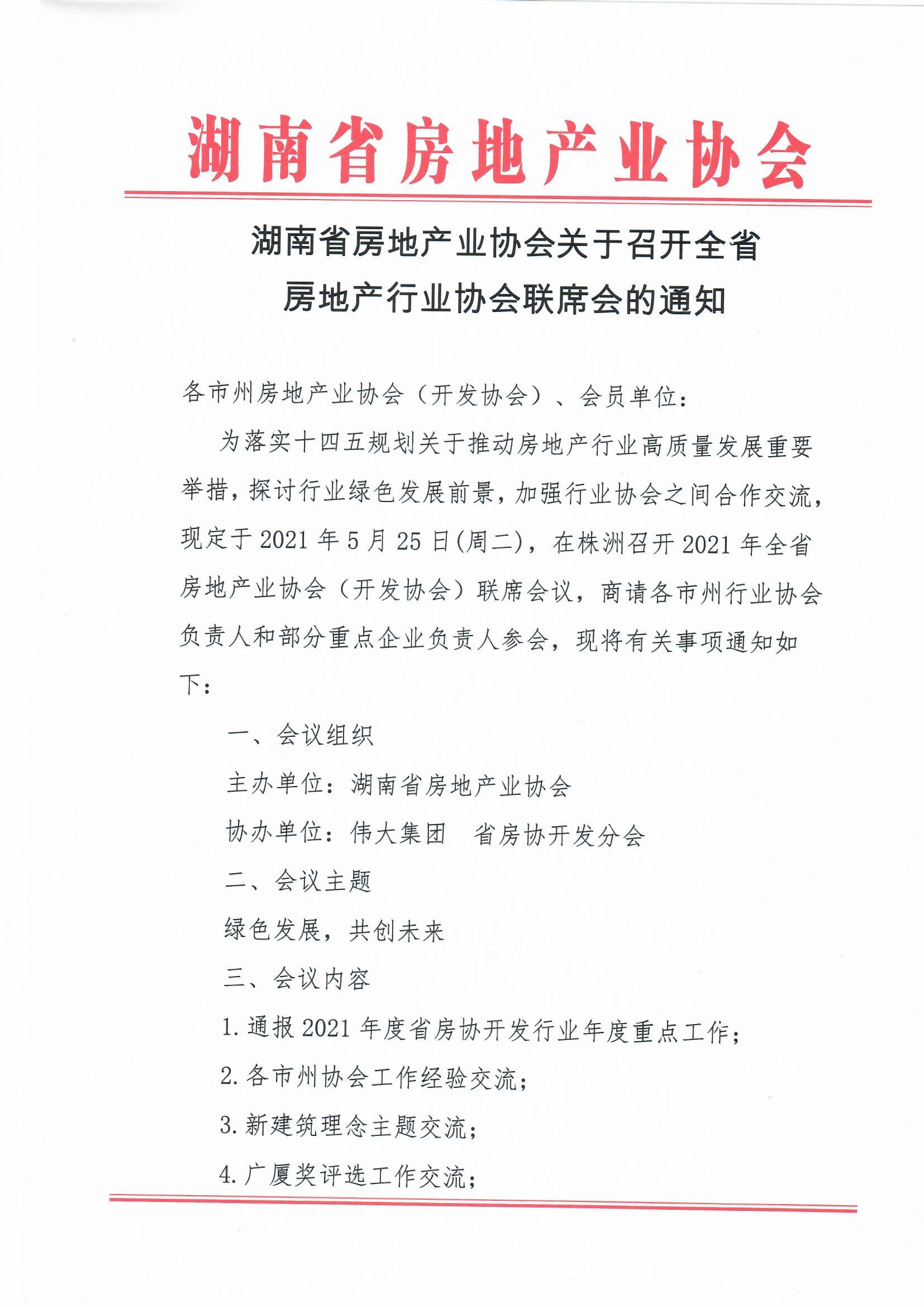 湖南省房地產業協會關于召開全省房地產行業協會聯席會的通知