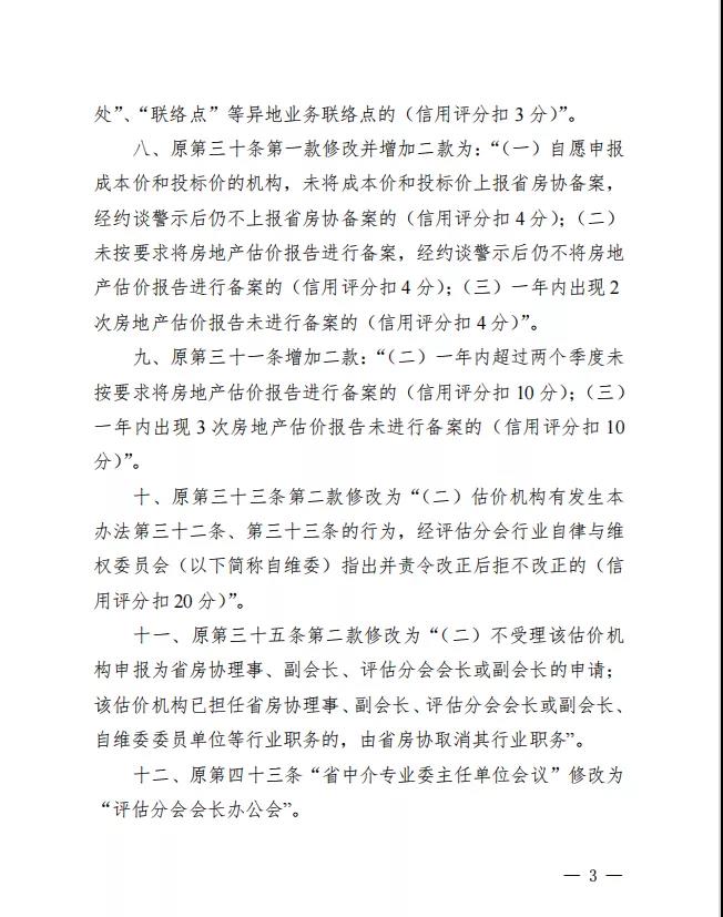 (三)納入失信記錄:將估價機構、估價人員的不良行為記入信用檔案,根據其情節嚴重納入提示信用記錄或警示信用記錄,并在業內通報,每次在企業信用評分中扣6-15分。
