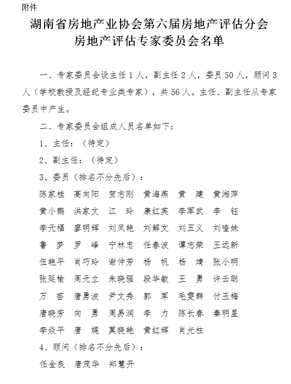 關于湖南省房地產業協會第六屆房地產評估分會房地產評估專家委員會名單的公示