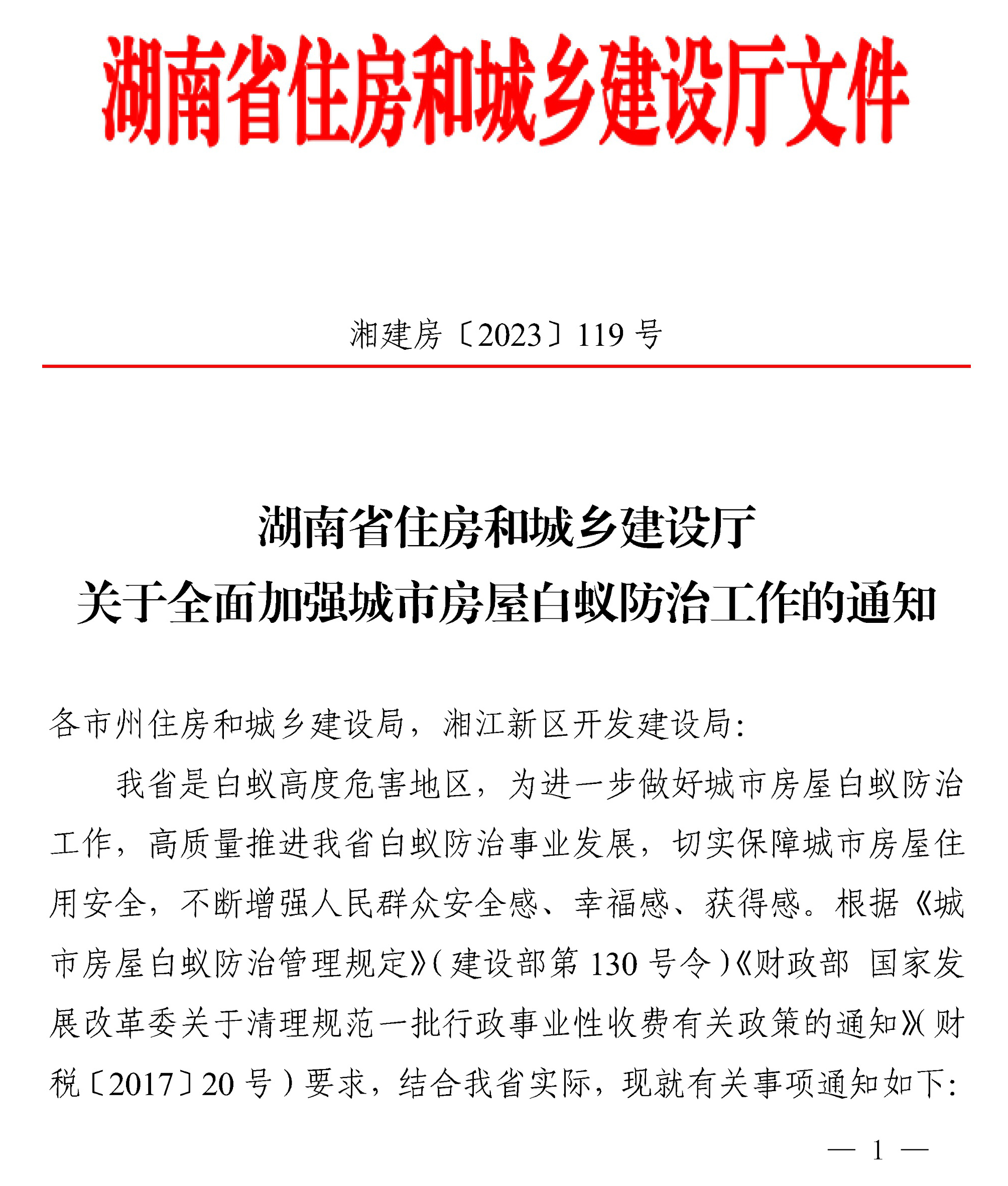 湖南省住房和城鄉建設廳關于全面加強城市房屋白蟻防治工作的通知