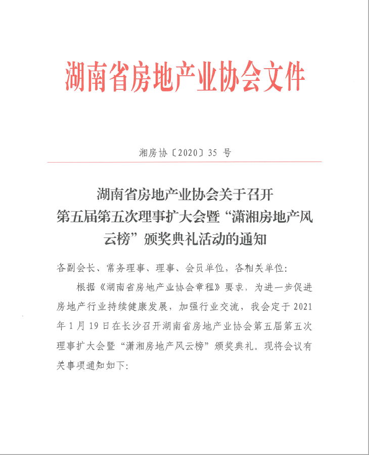 關于召開第五屆第五次理事擴大會暨“瀟湘房地產風云榜”頒獎典禮活動的通知