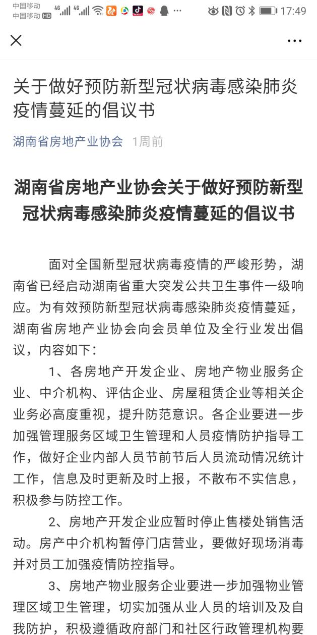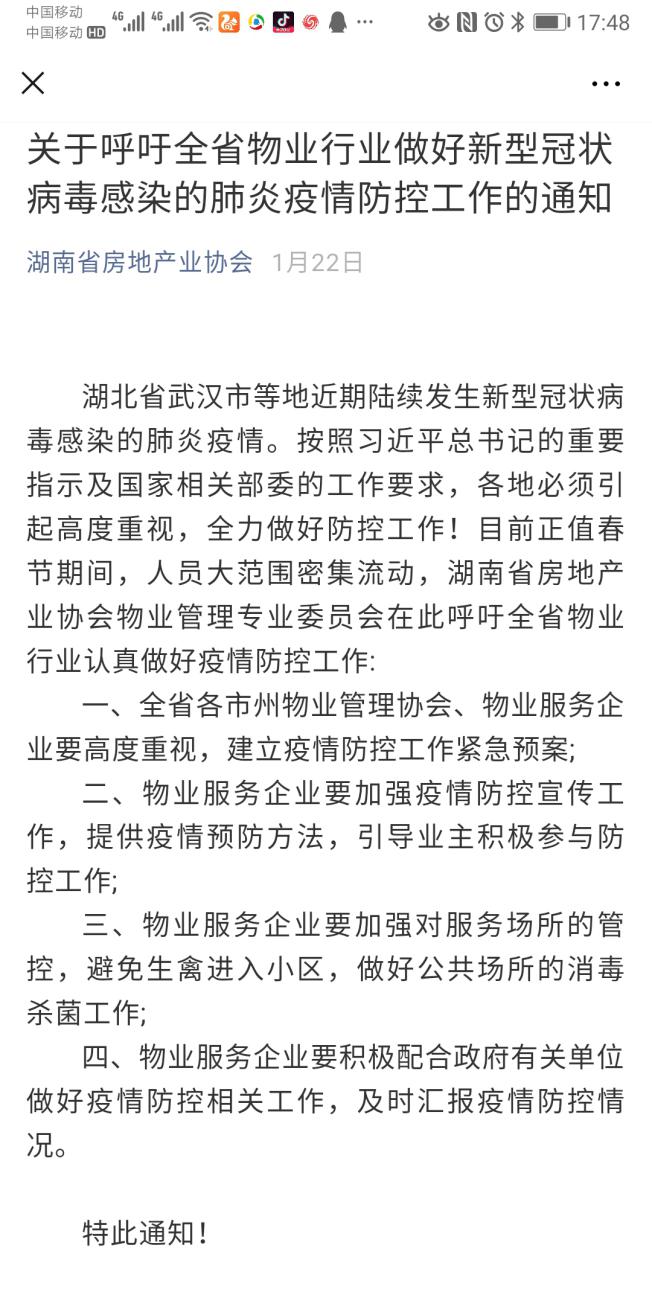 疫情就是命令,防控就是責(zé)任。肺炎疫情出現(xiàn)后,在國外與家人休年假的宋書記得知消息后第一時間通過網(wǎng)絡(luò)新聞了解了肺炎疫情概況,并迅速通過微信聯(lián)系了協(xié)會各部門負(fù)責(zé)人,針對疫情做出了應(yīng)急工作安排,當(dāng)天更是改簽了自己和家人回家的機(jī)票,提前取消了自己和家人的假期。1月26日,協(xié)會向全行業(yè)發(fā)布關(guān)于預(yù)防新型冠狀病毒感染肺炎疫情蔓延的倡議書,號召全行業(yè)和企業(yè)積極應(yīng)對,高度重視科學(xué)理性做好防范措施,同心協(xié)力打贏疫情防控狙擊戰(zhàn)。前期重點(diǎn)對我省物業(yè)行業(yè)發(fā)出了呼吁,要求做好新型冠狀病毒感染的肺炎疫情防控工作,要求建立疫情防控工作緊急預(yù)案,加強(qiáng)疫情防控宣傳,引導(dǎo)業(yè)主積極參與防控工作,同時加強(qiáng)服務(wù)場所的管控,做好公共場所的消毒殺菌工作,并要積極配合政府有關(guān)單位做好疫情防控工作,及時匯報疫情情況。隨著疫情的迅速爆發(fā),防疫形勢愈加嚴(yán)峻,為認(rèn)真貫徹落實(shí)和加強(qiáng)行業(yè)疫情防控工作,回國后宋書記更是召集黨支部各支委和各部門負(fù)責(zé)人召開疫情防控緊急專項會議,結(jié)合協(xié)會工作職能和疫情形勢又對全省房地產(chǎn)業(yè)疫情防控工作進(jìn)行了具體安排和部署。